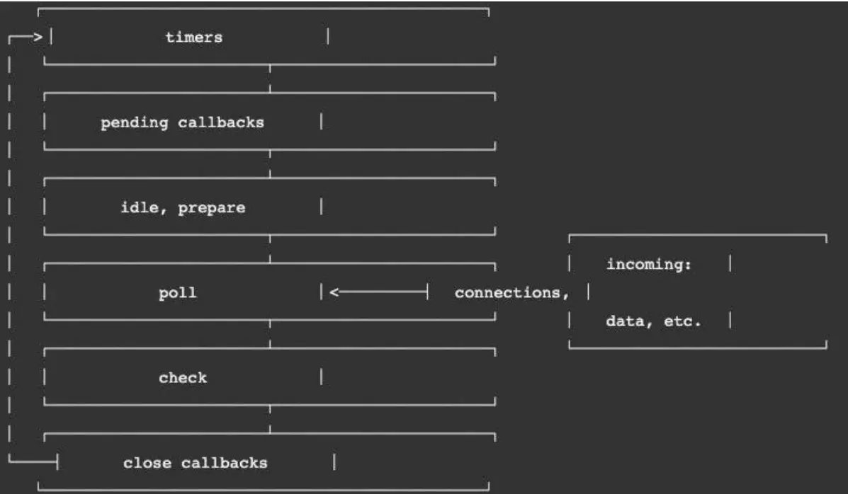 check):setImmediate() 回调函数在这里执行。 - 关闭的回调函数:一些关闭的回调函数,如:socket.on('close', ...)。